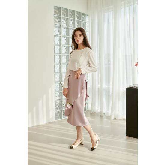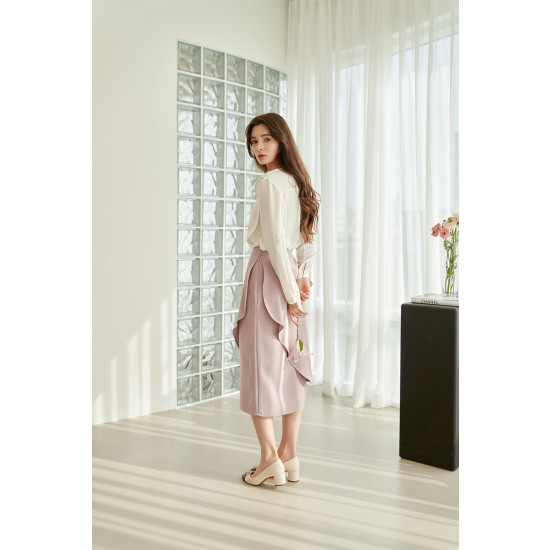 러플 디테일이 가미된 언밸런스드 랩스커트입니다.