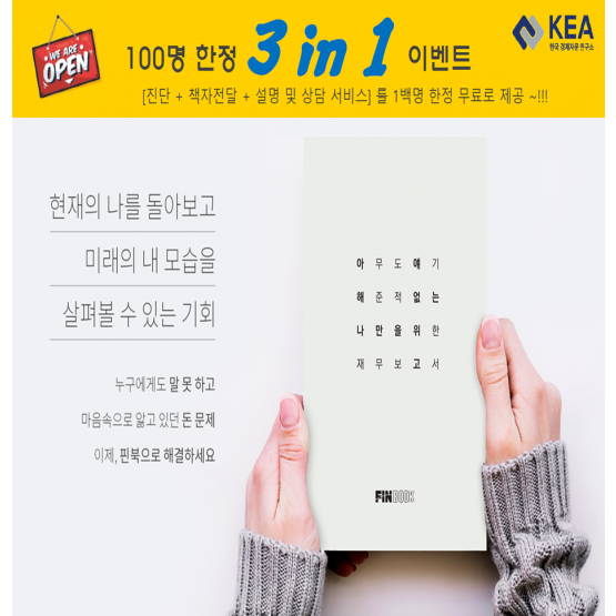 FIN BOOK은 Financial book의 약자로 빅데이터 기반의 재무분석엔진을바탕으로 [나의 재무상항]을 알려주는 1:1 맞춤형 재무설계보고서 입니다. 이번 이벤트는 개인 맞춤형 PIN-book을 무료로 제공하고 책자해설과 상담까지 받을 수 있는 이벤트입니다.